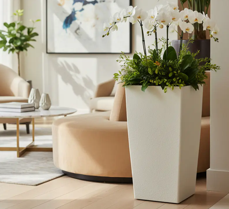 Von Gips inspirierte Texturen sind für ihre subtile Maserung und diffuse Lichtreflexion bekannt. Wenn diese Textur durch fortschrittliche Oberflächenform- und Veredelungstechniken auf Kunststoff aufgetragen wird, verändert sie die Art und Weise, wie das Pflanzgefäß mit seiner Umgebung interagiert. Anstatt das Licht scharf zu reflektieren, absorbiert die Oberfläche es und mildert es, wodurch die Blendung in hellen Räumen reduziert wird und die visuelle Konsistenz bei künstlicher Beleuchtung erhalten bleibt.